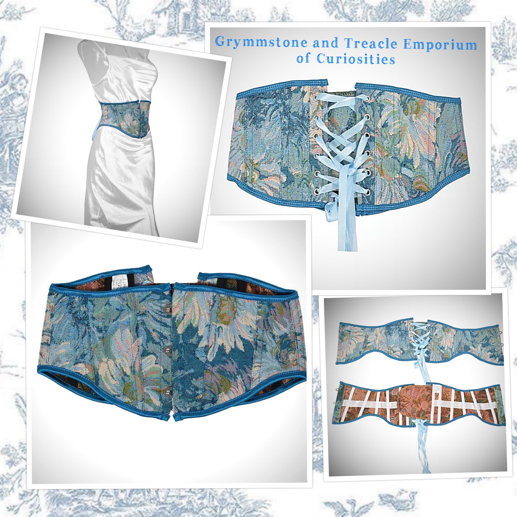 Gorgeous patterned brocade with ribbon lacing at the back and traditional busk hooks at the front are combined with soft boning to cinch in a gorgeous skirt or dress. Finished with a darker satin bias binding. Height at front and back is 16cm/ 6.5inches. Note: this is NOT for waist training.